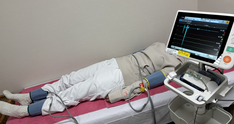 ベッドに仰向けに寝ていただき、両手・両足の血圧、心電図、心音を同時に測定します。 |