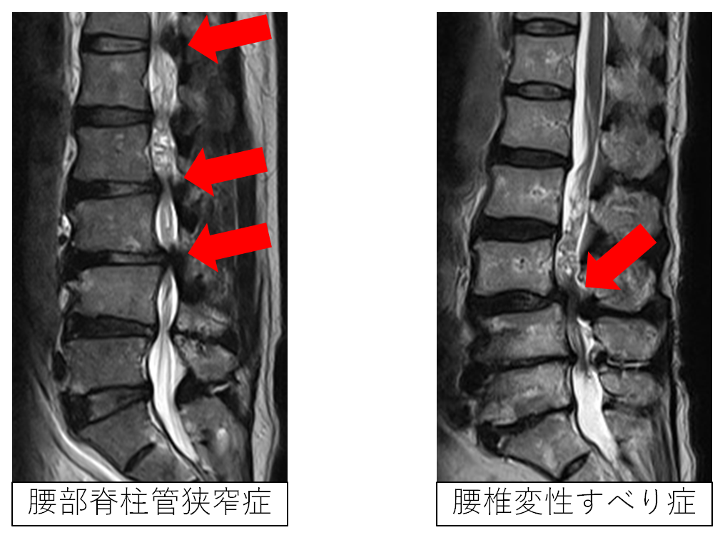 加齢に伴い、歩いているとだんだん足がしびれてしまい、休憩を取らないと歩けなくなる症状(間欠性跛行)がよく出現します。その原因として、脳、脊髄から足につながる神経が腰、お尻、太もも、ふくらはぎ、足首などで物理的に圧迫が加わり続けるために生じることが非常に多いです。 「腰部脊柱管狭窄症」や「腰椎すべり症」は、骨の変形、関節のずれ、分厚くなった靱帯や椎間板の飛び出しなどのために「脊柱管」と呼ばれる背骨の中の神経の通り道が狭くなることで「歩くと足がしびれる」ようになります。また、お尻や足首などでも神経が圧迫されることで同じような症状が出現します。足のしびれや痛みのことを「坐骨神経痛」とまとめて表現されますが、実はその原因は様々で、長年腰に原因があると思われていたものが、きちんと検査をうけてみたら、実は他の部位に原因があったということもよくあります。