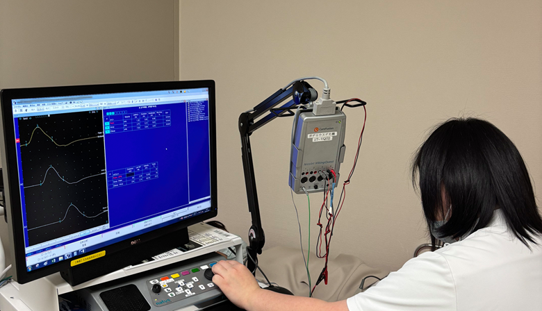 | 30~60分 | 手の神経の刺激が伝わる速度を測定手足に力が入らない場合や手足のしびれがある場合に、その原因を明らかにする検査です。 | ベッドに仰向けに寝ていただいて検査をします。 腕の神経を電気刺激して発生する活動電位を記録します。 |